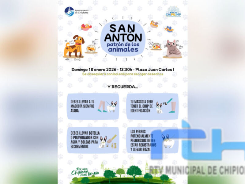El alcalde de Chipiona, Luis Mario Aparcero, ha comunicado que Ayuntamiento de Chipiona, a través del Plan Integral de Limpieza (CHIPLIMP), desarrollará este próximo domingo 18 de enero una actividad de concienciación y cuidado del entorno tras la tradicional bendición de los animales con motivo de la festividad de San Antón, patrón de los animales y el acto de bendición que se llevará a cabo en la Plaza Juan Carlos I.