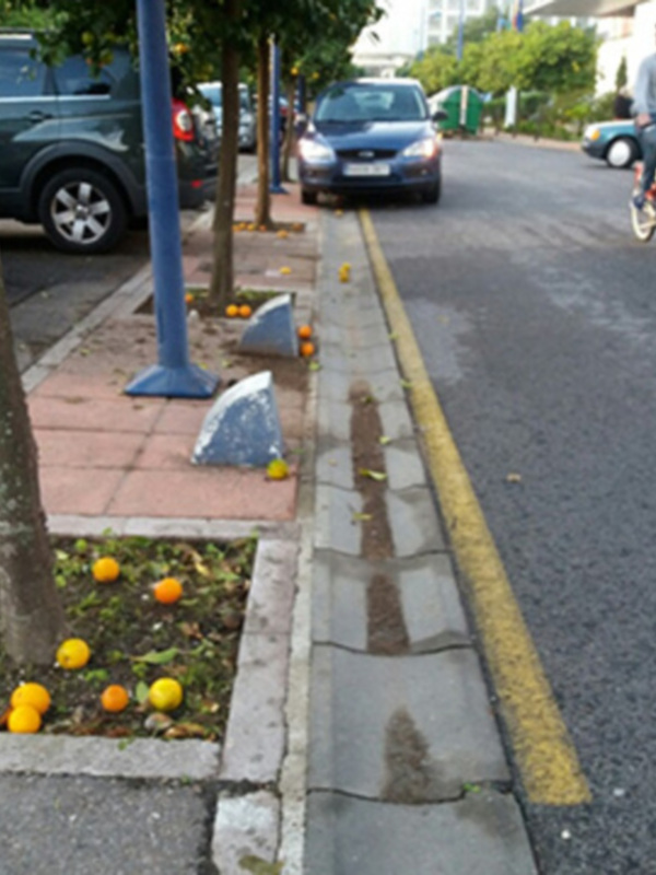 Los naranjos en Sevilla forman parte de un paisaje urbano diferente. El azahar es una singularidad de Sevilla. El visitante que pasea por las calles de Sevilla en plena floración se lleva grabado en su memoria un olor, que cuando vuelva a olerlo se acordará de su estancia en Sevilla. Las naranjas son amargas y se utiliza para hacer mermelada. Este año se adelanta la cosecha, ya podemos ver en el suelo las primeras naranjas.