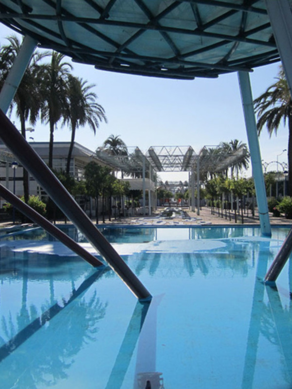 Se mantiene los pabellones de: Hungría, Finlandia, y FUJITSU. Esta avenida está fuera del PCT y lo divide en dos partes, es una vía pública de tránsito. Las láminas de agua y estanques se han mantenido. Se conserva al ESFERA, símbolo de la Exposición, sin sistema de nebulización y se conservan algunas estructuras de sombra (pérgolas) sin vegetación. Se ha mantenido algún modular. Se han eliminado los quioscos modulares. Calle Marie Curie, plantada de Melia azederach en las alineaciones de alcorques. Existen varios grupos de pérgolas que están plantadas con distintas especies de plantas trepadoras, tales como Bougainvillea spectabilis , Lonícera japonica y Hedera helix . En el interior de la avenida existen grupos de Citrus aurantium y numerosas Phoenix dactylífera y Whasingtonia robusta. En la parte situada más al oeste existe un parterre de 1.566,00 m2 de césped. La mayoría de las palmeras tienen plantadas en sus alcorques Bouganvillea .
