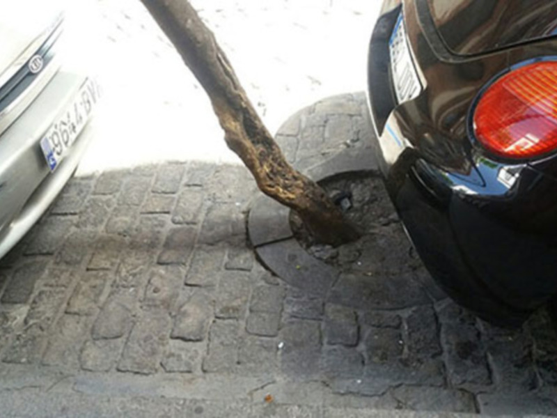 Es frecuente encontrar árboles en la vía pública que son agredidos por los vehículos aparcados. El conductor no teme al árbol, es blando y no le daña el coche. Para, cuando oye el golpe. Golpe a golpe el árbol se va inclinando. Los vehículos paran cuando la ruedas delanteras o traseras hacen tope con el acerado o bordillo. Hay que tener en cuenta que el morro de un vehículo puede avanzar hasta 50 cm o más del bordillo, dependiendo del modelo de coche y esto hay que tenerlo en cuenta a la hora de organizar el espacio urbano, combinando plazas de aparcamiento y arbolado. Foto calle Monsalves, Sevilla.