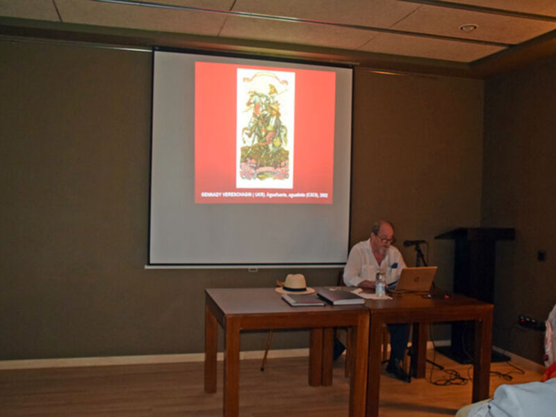 Con gran conocimiento y pasión, José Miguel Valderrama abordó también su experiencia en la organización de las actividades conmemorativas del IV Centenario de la publicación de la segunda parte del Quijote, un ciclo que incluyó conferencias y exposiciones dedicadas a la inmortal obra de Miguel de Cervantes y al contexto cultural de su tiempo. En este marco, su ponencia “Don Quijote en los Exlibris” ofreció un recorrido por las múltiples interpretaciones artísticas que el caballero de la triste figura ha inspirado en coleccionistas y grabadores de todo el mundo.