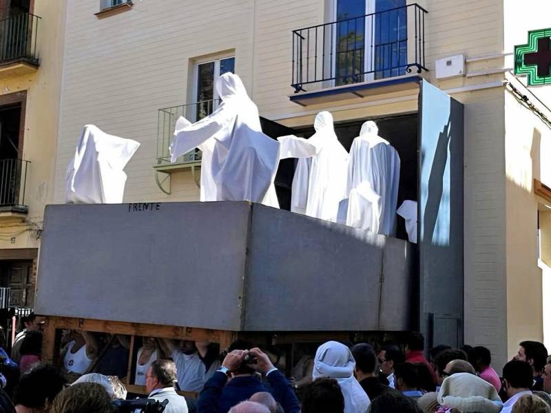 El pasado día 15 se pudo ver un rito , todo un clásico de la cuaresma sevillana que congrega a muchos " devotos " es el traslado del formidable misterio con sus figuras secundarias ensabanadas y protegidas , del desprecio de Herodes, del almacén a su templo.