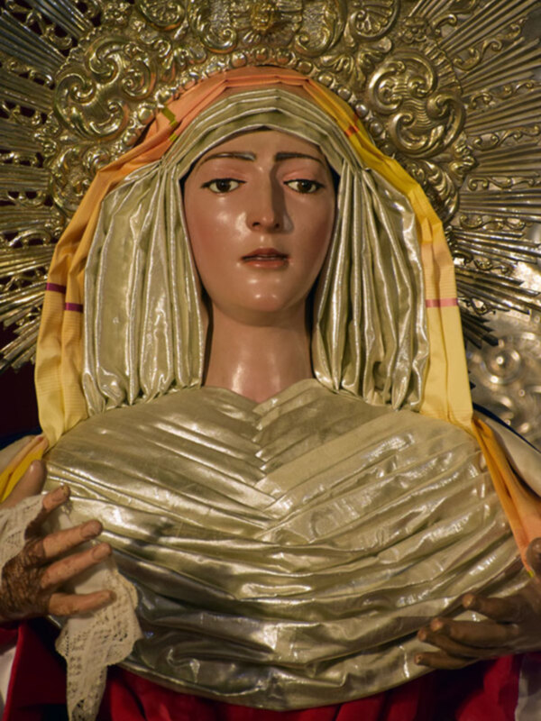 La Stma Virgen de la Esperanza, se vistió de hebrea, símbolo de la cuaresma como manda los cánones palestinos, en la ribereña localidad sevillana de Alcalá del Río. La vestimenta de hebrea, pese a que puede ofrecer distintas variaciones de colores o tejidos, suele presentar normalmente un manto azul en raso, que puede ser en todos más claros, dando así un poco de más alegría, o en tonos oscuros, lo que da recogimiento y elegancia a la Dolorosa que lo porta. También en lugar del raso, se está utilizando últimamente el terciopelo, que un tejido de más calidad. Es característico también que el forro del manto sea en color blanco, por lo que al colocarlo, el doblez destaque como una franja blanca sobre la cabeza y los hombros de la Virgen. En cuanto al color de la saya, siempre se usa el rojo, y al igual que el manto, se emplea en tonos claros u oscuros dependiendo de la seriedad y carácter que se le quiera dar a la hermandad. Los orígenes de esta vestimenta, se sitúa en los años 20. La primera dolorosa en presentarlo, fue la Virgen de la Hiniesta (Sevilla), que a punto estuvo de procesionar así vestida en su paso de palio. Llego de la mano del genial Juan Manuel Rodríguez Ojeda, que improviso con un papel de seda el rostrillo, probablemente la escasez en ajuar de la época pudo ser el germen del estilo que todo conocemos como hebrea pero que corresponde más a cánones Palestino.