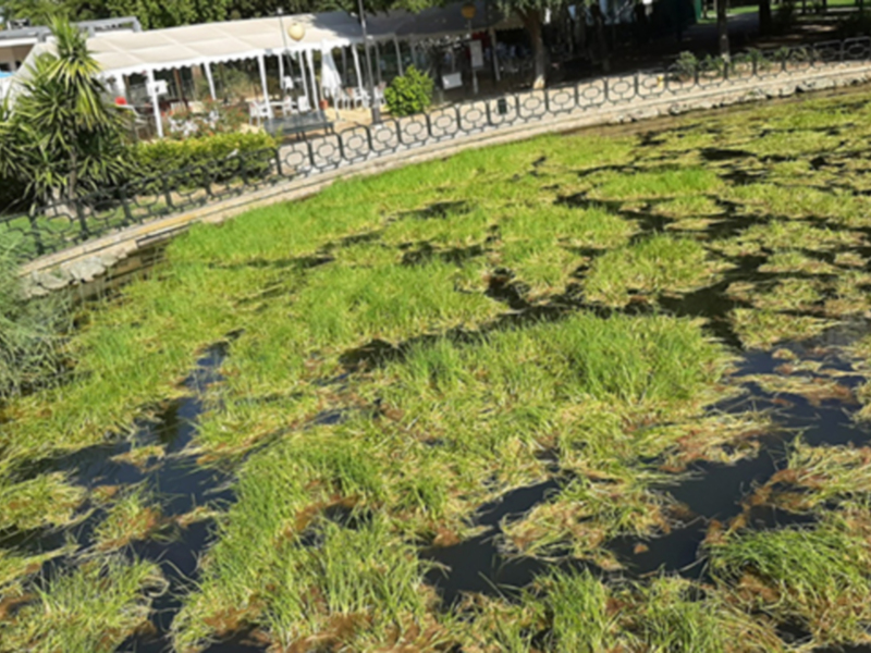 Alertado por las noticias aparecidas en la prensa local me acerque al parque para conocer in situ lo que pasaba, la US Universidad de Sevilla y sus científicos están en ello. Las plantas acuáticas, también denominadas macrófitos acuáticos o hidrófitos, no son organismos especialmente atractivos son poco vistosos y algunos manifiestamente invasivos en general, como la enea,el jacinto de agua, la lechuga de agua, la lenteja de agua etc...,aunque algunos se utilizan en la jardinería ornamental con flores llamativas como, los lotos,los nenúfares las victorias etc.... Una especie de la flora acuática del género Sparganium angustifolium no habitual en los estanques y lagunas de los parques y jardines de la ciudad, desconocida hasta la fecha, con su rápido crecimiento ha colonizando el estanque, otras veces invadido por las algas tradicionales de los meses de calor.