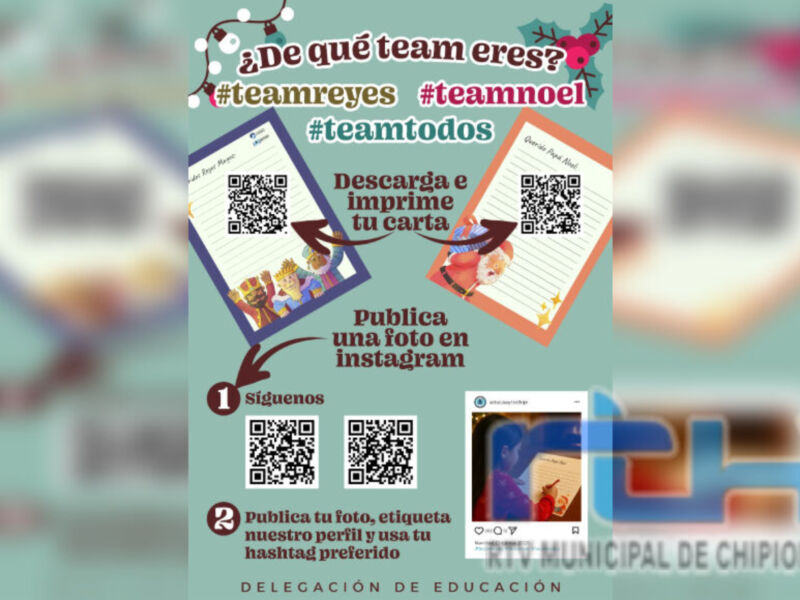 La Delegación de Educación del Ayuntamiento de Chipiona ha puesto en marcha una iniciativa navideña destinada a los niños y niñas del municipio bajo el título ‘¿De qué team eres? Team Reyes, Team Noel o Team Todos’. Esta actividad se presenta a través de un cartel que incluye un código QR, mediante el cual los menores pueden descargarse un modelo de carta para dirigirla a uno o a ambos personajes navideños, fomentando así la creatividad y la expresión escrita de forma divertida.