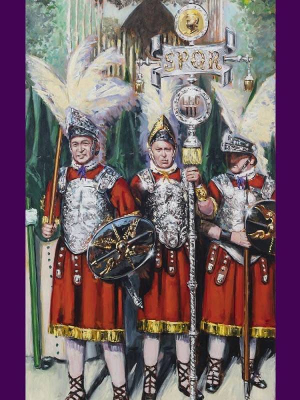 El óleo muestra a la Centuria delante del paso de la Virgen de la Esperanza en la Resolana, envuelta en una luz intensa que simboliza la alegría macarena tras la Madrugá. El Senatus abre paso como signo de fidelidad, mientras los “cirios verdes” preceden al paso de palio. La obra incluye además un recuerdo emocionado a nuestro hermano D. Joaquín García Barrera, testimonio de que los Armaos que partieron siguen presentes en el corazón de la Hermandad.