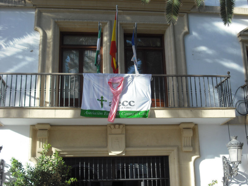 Las concejalas del equipo de gobierno y miembros de la Asociación Española Contra el Cáncer de Chipiona han colocado en el balcón principal de la casa consistorial una pancarta de la AECC con un lazo de color rosa, distintivo de la lucha contra cáncer de mama.