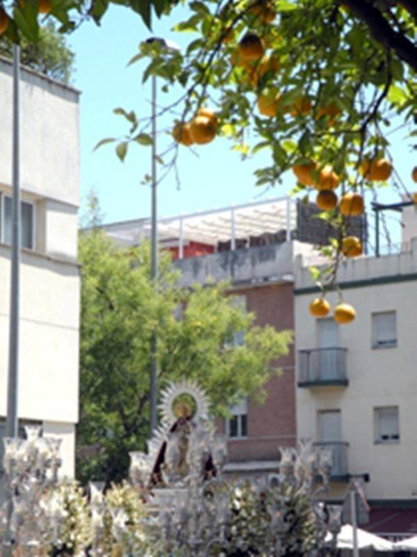 La procesión estaba encabezada por la cruz de guía, seguida por los cofrades trianeros y hermanos/as del Cachorro, con cirios blanco, y a continuación estandartes representativo de Hermandades Trianera y el paso de la virgen que estuvo acompañada musicalmente por la formación musical juvenil de la Hermandad de los Gitanos entrando pasada las 13´30 horas de la tarde.