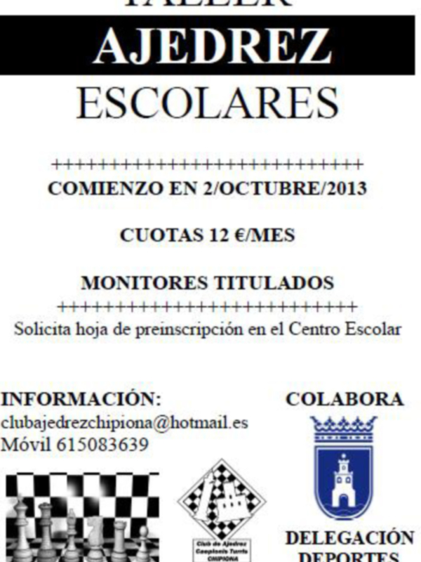 El Club de Ajedrez Caepionis con la colaboración de la delegación municipal de Deportes va a poner en marcha talleres escolares impartidos por monitores titulados. El precio es de 12 euros mensuales. Los interesados pueden dirigirse a la delegación de Deportes, el correo electrónico clubajedrezchipiona@hotmail.es o el teléfono 615083639.