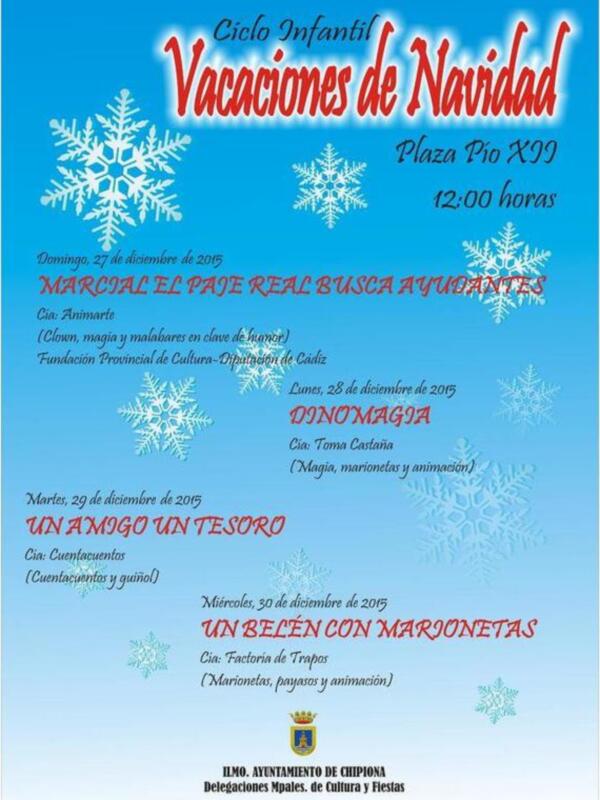 Radio-Televisión Municipal de Chipiona, 27 de noviembre de 2015 Las Delegaciones de Cultura y Fiestas han organizado un ciclo infantil de actividades para las vacaciones de navidad de los niños y niñas de Chipiona. Las actividades se desarrollarán en la Plaza Pío XII a las 12:00 horas que comenzará el domingo 27 de diciembre con el espectáculo ?Marcial el paje real busca ayudantes? de la compañía Animarte con una oferta de magia y malabares en clave de humor.