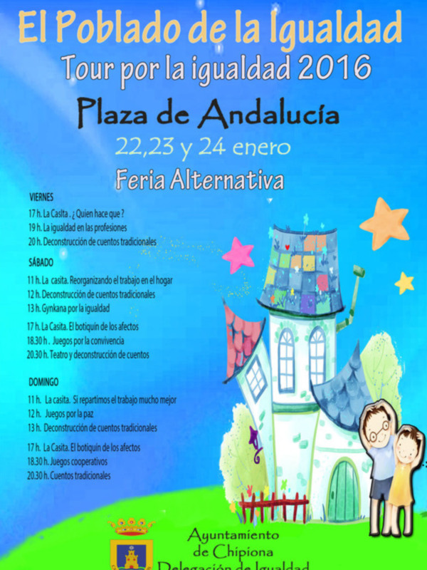 Este viernes a las 17:00 da comienzo el POBLADO DE LA IGUALDAD, actividad lúdico educativa organizada desde la Delegación igualdad del Ayuntamiento de Chipiona que se prolongará a lo largo de todo el fin de semana en La Plaza de Andalucía. Va destinada a niños y niñas de entre 3 y 12 años y a través de gynkanas, cuentacuentos, teatro y juegos cooperativos se trabajarán los roles y estereotipos de género en un entorno de diversión y de educación en valores. Se trata de actividades gratuitas y abiertas, para las que no se requiere inscripción previa y en las que también puede participar el resto de la familia. El Poblado de la Igualdad se acompaña de un mercado alternativo donde las familias pueden encontrar un estupendo entorno para pasear aprendiendo en igualdad