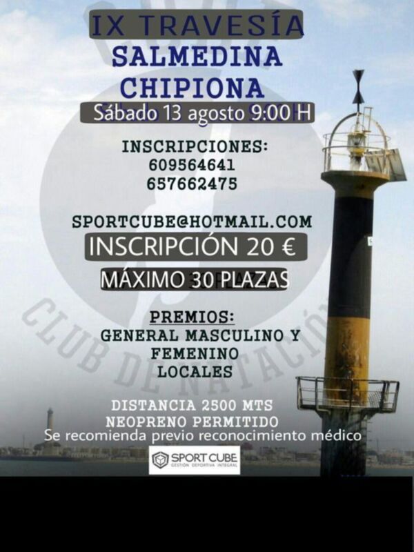 Un año más Sport Cube y Club Natación Cube, con la colaboración de la delegación de Deportes de Chipiona, organizan una de las travesías más espectaculares de la bahía, una prueba única por la belleza de su recorrido de 2500 metros aproximados.