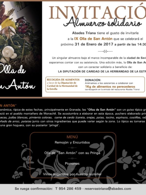 invitación para degustar el próximo día 31 de enero, la tradicional Olla de San Antón en el restaurante de Sevilla de Grupo Abades, Abades Triana.