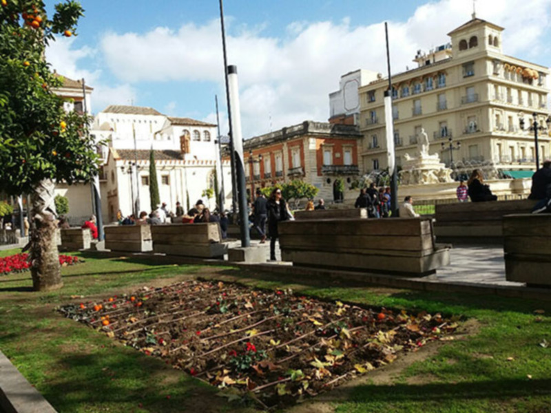 Afortunadamente las fuertes rachas de viento que han llegado hasta 180 km/hora en el norte de España, no han llegado al sur. Las lluvias seguidas de viento han provocado cuantiosos daños en parques y jardines. Foto parterre en Puerta jerez.
