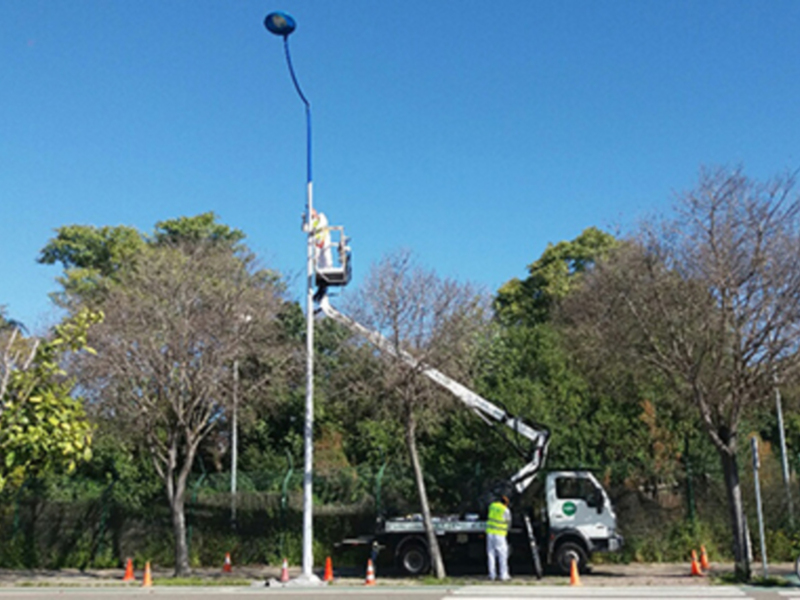 El deterioro de las farolas de la EXPO92 ha obligado a realizar a operarios municipales una actuación de mejora y pintado de farolas.