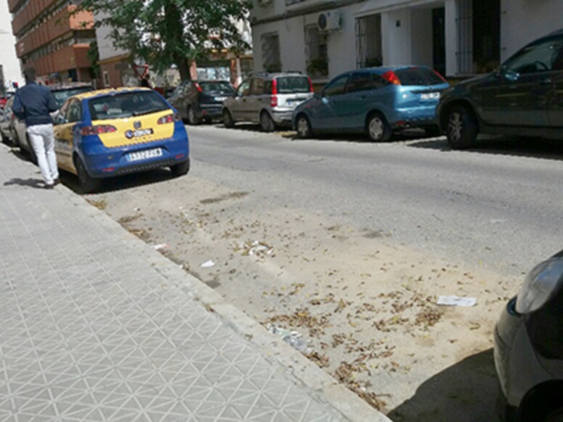 La ocupación de la vía pública por los coches aparcados no permite la limpieza de la manera habitual de como se realiza en espacios no ocupados. Esta circunstancia genera la necesidad de hacer la limpieza de la suciedad existente bajo los vehículos aparcados, mediante sopladoras que mueven la suciedad al centro de la calle para que una máquina barredora la recoja. En esta calle de la foto hace una semana que ha pasado la barredora con dos operarios de limpieza equipados con máquinas sopladoras.