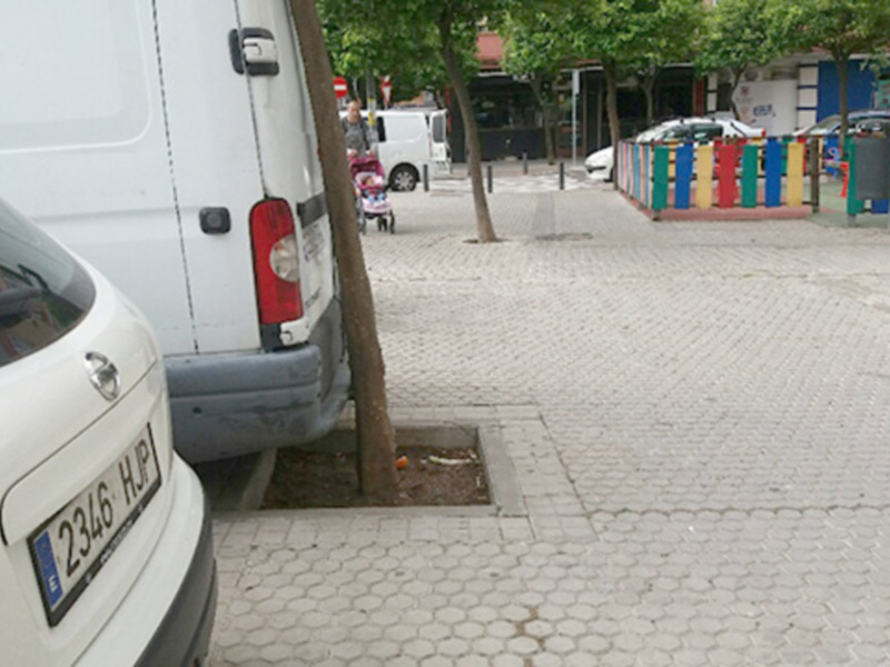 El mal diseño de los alcorques permite que los vehículos puedan causar daños al árbol en la vía pública.