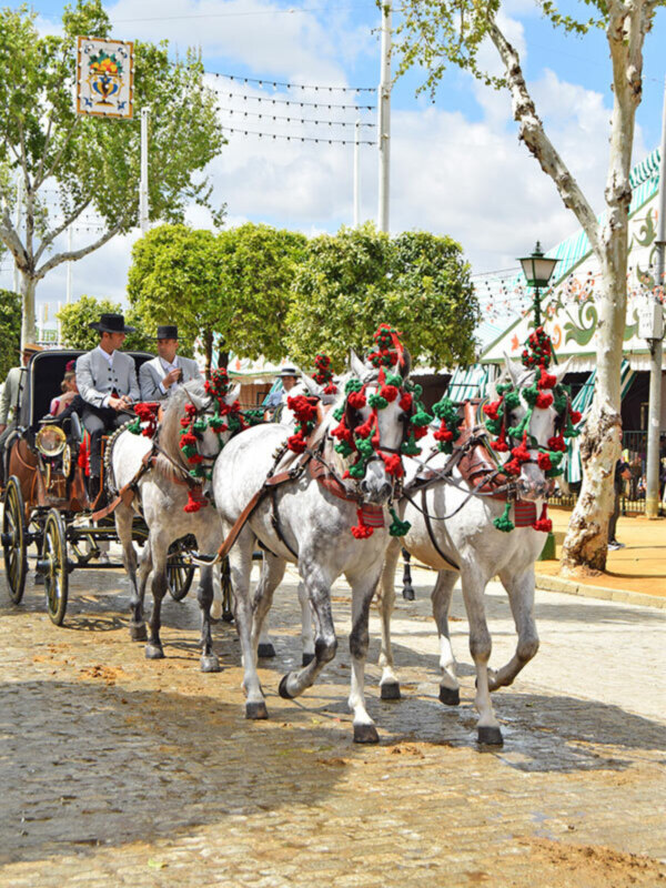 Los alegres sonidos de los cascabeles se mezclan con las pisadas de los animales, el brillo del charol de los coches se entrecruza con la visión de las flores que embellecen a las mujeres vestidas de flamenca, y los caballistas compiten en agilidad con la de los cocheros que guían los enganches tirados por hermosos caballos en el bullicio de la tarde.