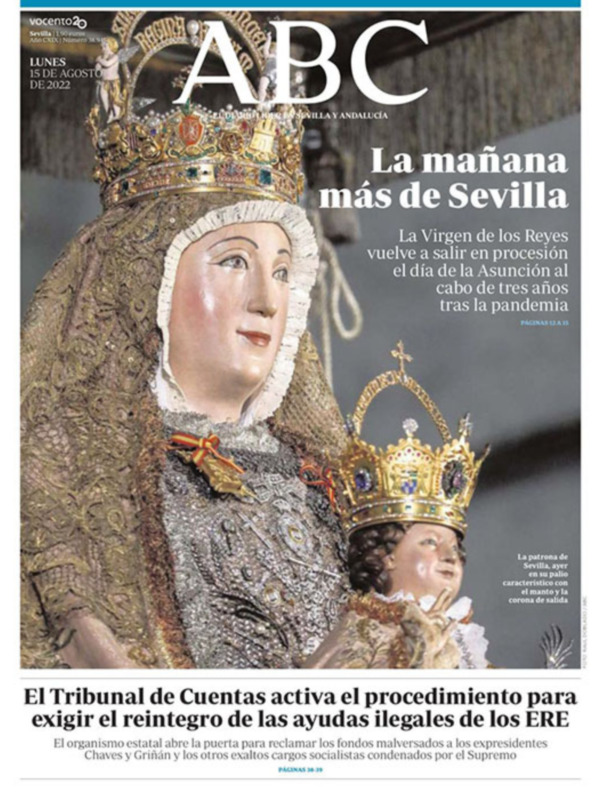 Tres vecinas de la Virgen, por José Joaquín Gallardo Rodriguez. Amanecerá hoy un esplendoroso 15 de agosto de Asunción mariana y lo celebraremos al peculiar modo de Sevilla, que no en vano aquí la proclamamos Inmaculada anticipándonos en siglos a Roma, la veneramos como Virgen de los Reyes mucho antes de instituirse la festividad de Santa María Reina y la tenemos por patrona de la ciudad y su archidiócesis. Tras el dramático paréntesis de oscuridad en nuestras vidas vuelve el glorioso día de la Virgen que es madre gozosa de Dios Niño, serenidad majestuosa bajo palio de tumbilla de quien reina en nuestros corazones y aroma de todos los nardos y rayos de sol del nuevo día. Justamente porque por Ella reinan los reyes, su presencia suscita el más alegre repique general de la giralda y los mayores honores catedralicios.