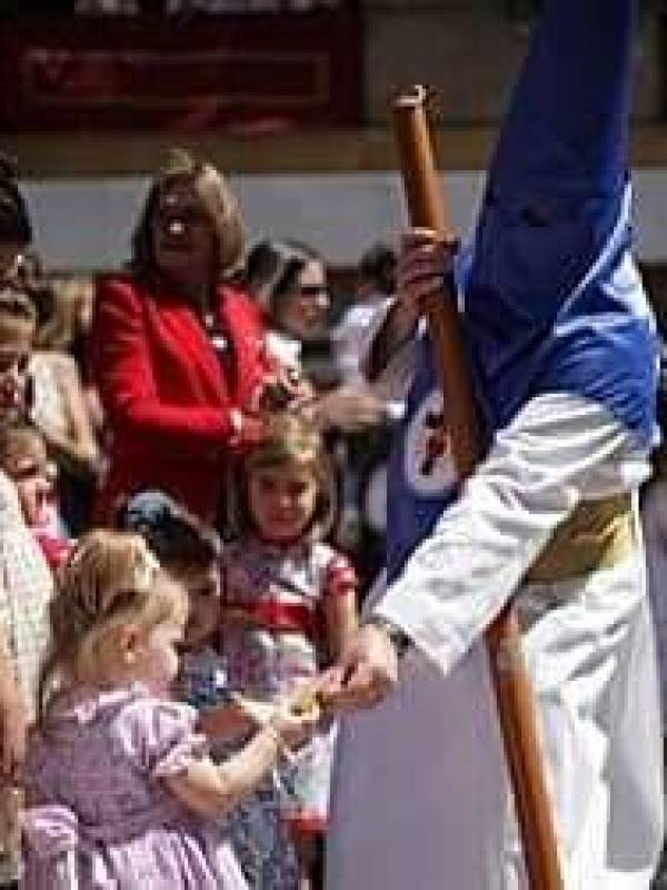 Puede que tu mano tenga arrugas pero hoy es la de ese niño que pide un caramelo o la de que en su bola de cera tiene el mundo, manos que sujetan un antifaz , del incensario, del nazareno que lleva a pulso un cirio, de un penitente que desgrana un rosario en el barniz de una cruz de madera, de un muchacho que gira la llave de una corneta, o la que abre un cerrojo y te permite ver la cruz de guía ,mano del costalero que sale descarada por un faldón , o del capataz que coje el martillo de al cielo con ella!!
